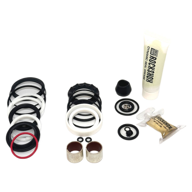 Full service kit for annual service of shock, including new bushings. Installed using Sram Dynamic Seal Grease, and 15w 50 air can lube - Both included!